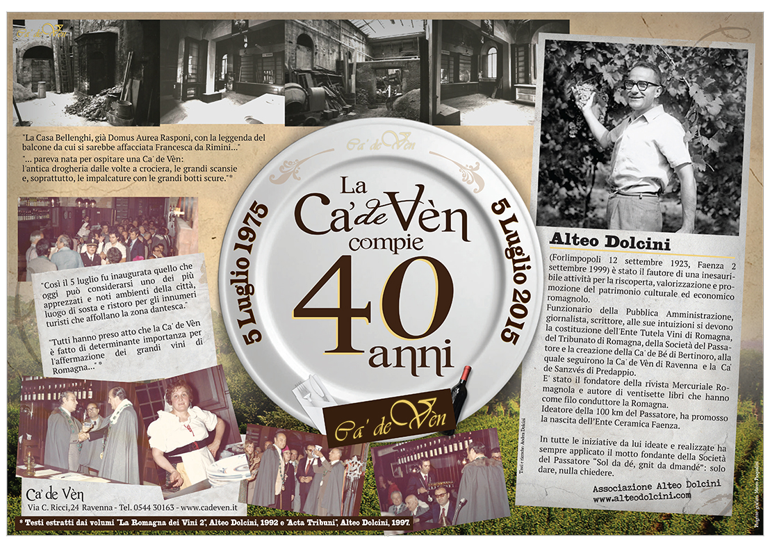 L’Associazione Alteo Dolcini ha raccolto immagini e testi (provenienti dal Fondo Alteo Dolcini) per ricordare questa importante ricorrenza. D’intesa con Rita Mazzillo, guida vitale della Ca’ de Vèn, sono stati realizzati dei sottopiatti celebrativi (curati da Andrea Dolcini e Marco Pasqualini) con alcune foto inedite e testi che raccontano quanto avvenne quarant’anni fa. A settembre saranno in mostra tutte le immagini dell’inaugurazione oltre a foto della storica Drogheria Bellenghi prima dei lavori di costruzione della Ca’ de Vèn.