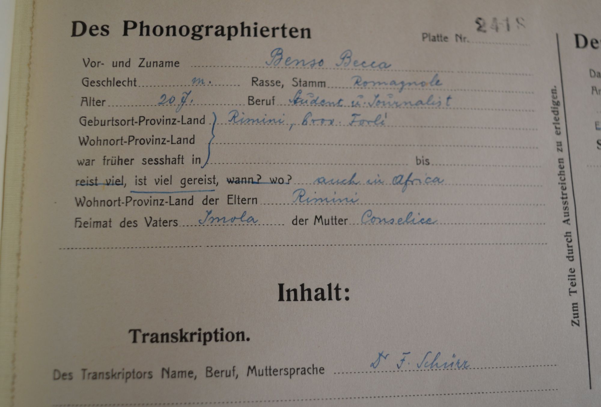 Un emozionante tuffo nel passato per ascoltare le voci dei romagnoli che oltre un secolo fa furono scelti per leggere un questionario di frasi (oltre a poesie, sonetti e brani di opere teatrali dialettali) preparate da Schürr grazie al sostegno di Aldo Spallicci. L’interesse di Schürr per la lingua romagnola ebbe origine nel 1911 quando, studente di filologia romanza presso l’Università di Vienna, approfondì lo studio del “Pvlon matt”, il primo poema scritto in romagnolo alla fine del XVI secolo. Le registrazioni gli consentirono di conoscere le diverse pronunce che da Imola a Rimini contraddistinguono la lingua parlata romagnola.