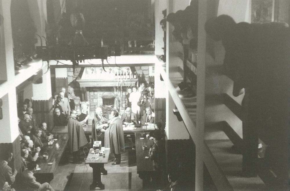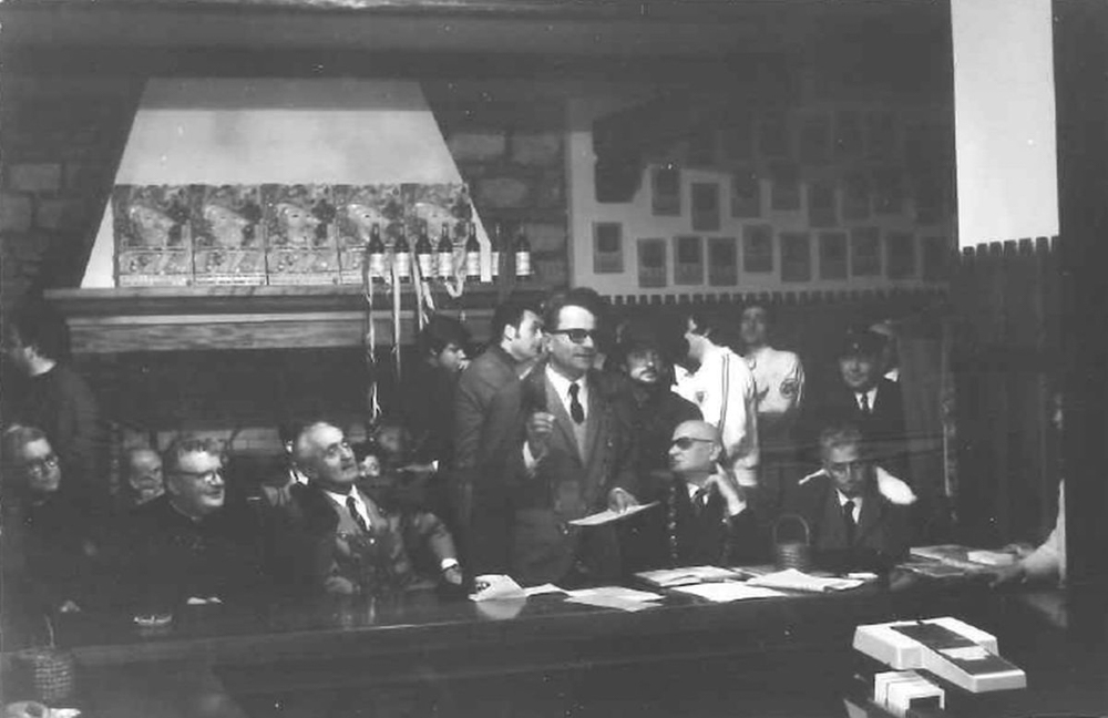 Il locale, allora gestito dalla famiglia Gurioli, è stato sia un punto di riferimento enogastronomico sia la sede di giornate di studio e convegni che hanno stimolato quello che Dolcini chiamava “il grande Rinascimento vitivinicolo romagnolo”. Il 12 aprile 1971 la piazza della Libertà di Bertinoro era gremita, la folla poté assistere al lancio dei paracadutisti del gruppo acrobatico della Società del Passatore e all’esibizione della Banda del Passatore di Brisighella.  Le immagini presentano gli interni della Ca’ de Bè e testimoniano la peculiarità degli arredi curati da Pietro Novaga e l’effetto scenico degli stemmi ceramici recanti i nomi dei Tribuni di Romagna, da Aldo Spallicci ad Andrea Emiliani, da Francesco  Serantini a Friedrich Schurr.