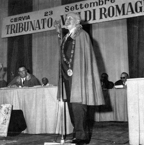 “E’ urgente, comunque, darsi una bandiera. Non tanto per essere la prima regione ad averla (ma nessuna regione è “nazione” come la Romagna che non è come le altre una ”espressione amministrativa”) quanto per poterla far garrire quando ce ne volessero imporre un’altra”. (AD, Atti del Tribunato di Romagna, 1973)
