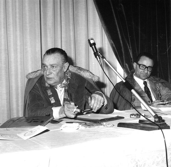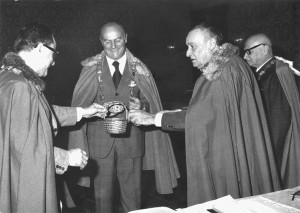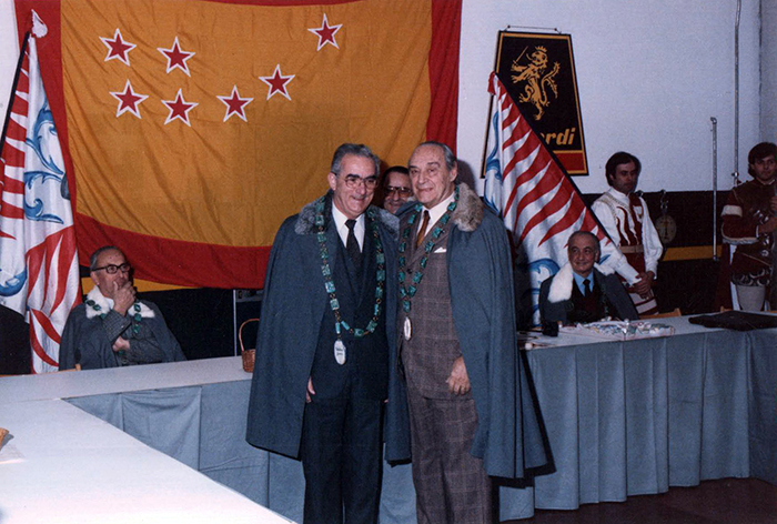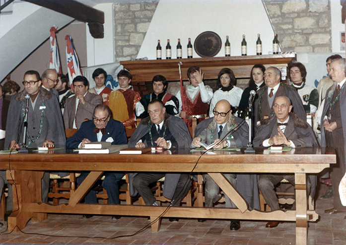 13 febbraio 1967, Bertinoro. Prima tornata costituente del Tribunato dei Vini di Romagna. Un anno prima Alteo Dolcini (AD) ha conosciuto Max David. L’idea di lavorare “per la nostra terra, la nostra gente” si concretizza in un senato che include personalità romagnole di spicco nel campo culturale, scientifico ed economico e accoglie stimati personaggi in ambito nazionale ed internazionale che nella loro attività hanno espresso interesse ed amicizia per la Romagna, i suoi vini, la sua cultura.