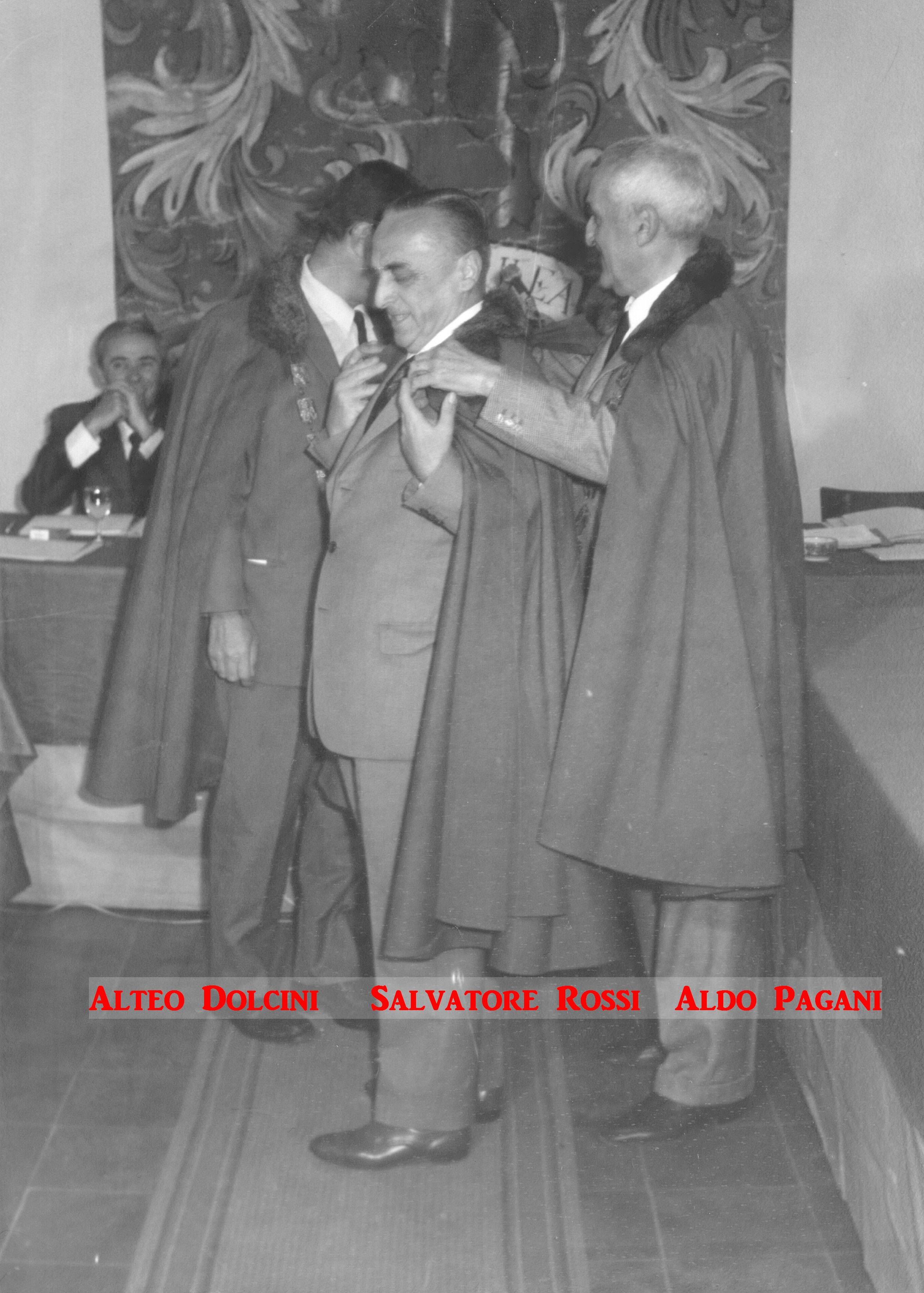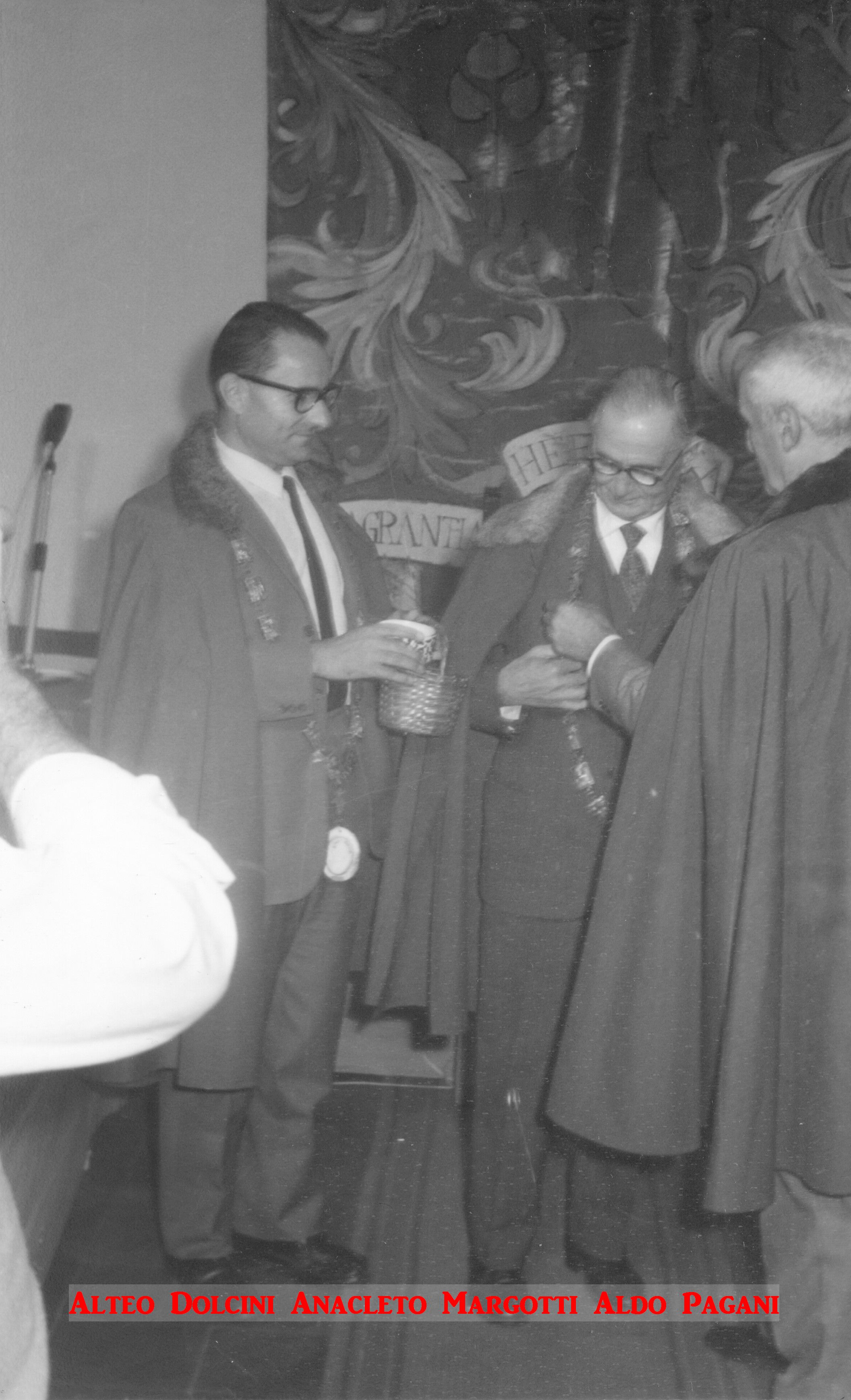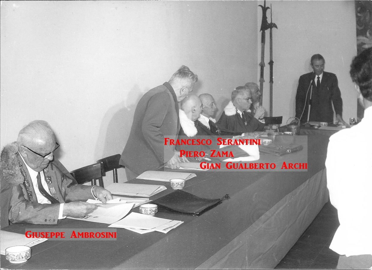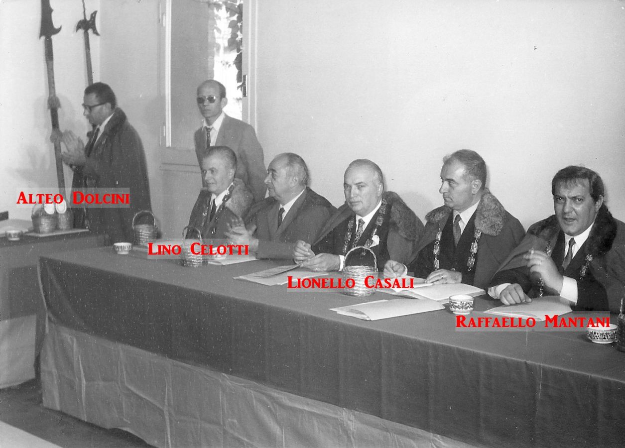 Queste immagini inedite attestano gli avvenimenti e i protagonisti dell’undicesima Tornata del Tribunato di Romagnola, svoltasi il 4 ottobre 1969 presso il Palazzo Sforza a Cotignola. Dalle pagine dell’Acta Tribuni si apprende che nell’incontro di Cotignola si affrontò il tema della lotta giuridica per la difesa dei vini Doc romagnoli (all’epoca Albana, Sangiovese e Trebbiano) e in particolare per vietare “la produzione di qualsiasi sangiovese che non sia di Romagna”. Alteo Dolcini relazionò poi sulla salvezza dei vitigni minori e fu approvato uno specifico documento per salvaguardare cagnina, canena, pagadebit, uvadora e vin di bosco. Tre le incapparellature per i nuovi tribuni Luigi Fontana, Anacleto Margotti, Salvatore Rossi. Nel corso della Tornata intervennero anche i tribuni Mario Neri e Giuseppe Ambrosini rispettivamente sui temi della riscoperta del vitigno della canena e del vino nello sport. Le foto sono state fornite da Emanuele Tonini per l’Associazione Pro Loco di Cotignola.
