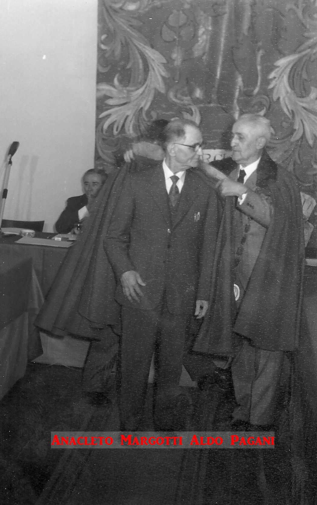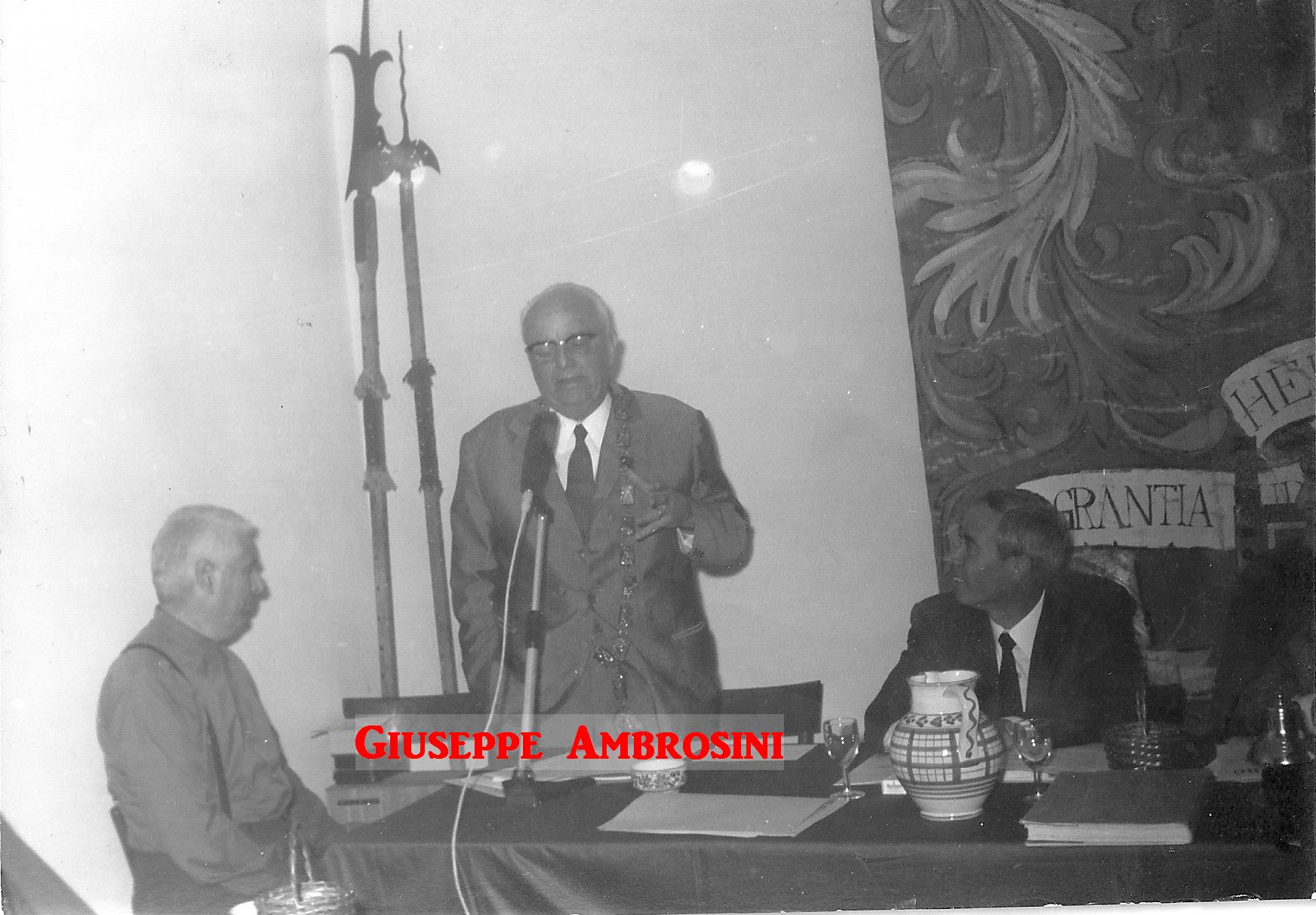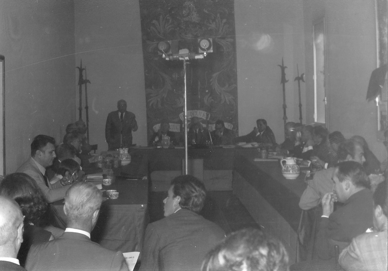 Queste immagini inedite attestano gli avvenimenti e i protagonisti dell’undicesima Tornata del Tribunato di Romagnola, svoltasi il 4 ottobre 1969 presso il Palazzo Sforza a Cotignola. Dalle pagine dell’Acta Tribuni si apprende che nell’incontro di Cotignola si affrontò il tema della lotta giuridica per la difesa dei vini Doc romagnoli (all’epoca Albana, Sangiovese e Trebbiano) e in particolare per vietare “la produzione di qualsiasi sangiovese che non sia di Romagna”. Alteo Dolcini relazionò poi sulla salvezza dei vitigni minori e fu approvato uno specifico documento per salvaguardare cagnina, canena, pagadebit, uvadora e vin di bosco. Tre le incapparellature per i nuovi tribuni Luigi Fontana, Anacleto Margotti, Salvatore Rossi. Nel corso della Tornata intervennero anche i tribuni Mario Neri e Giuseppe Ambrosini rispettivamente sui temi della riscoperta del vitigno della canena e del vino nello sport. Le foto sono state fornite da Emanuele Tonini per l’Associazione Pro Loco di Cotignola.