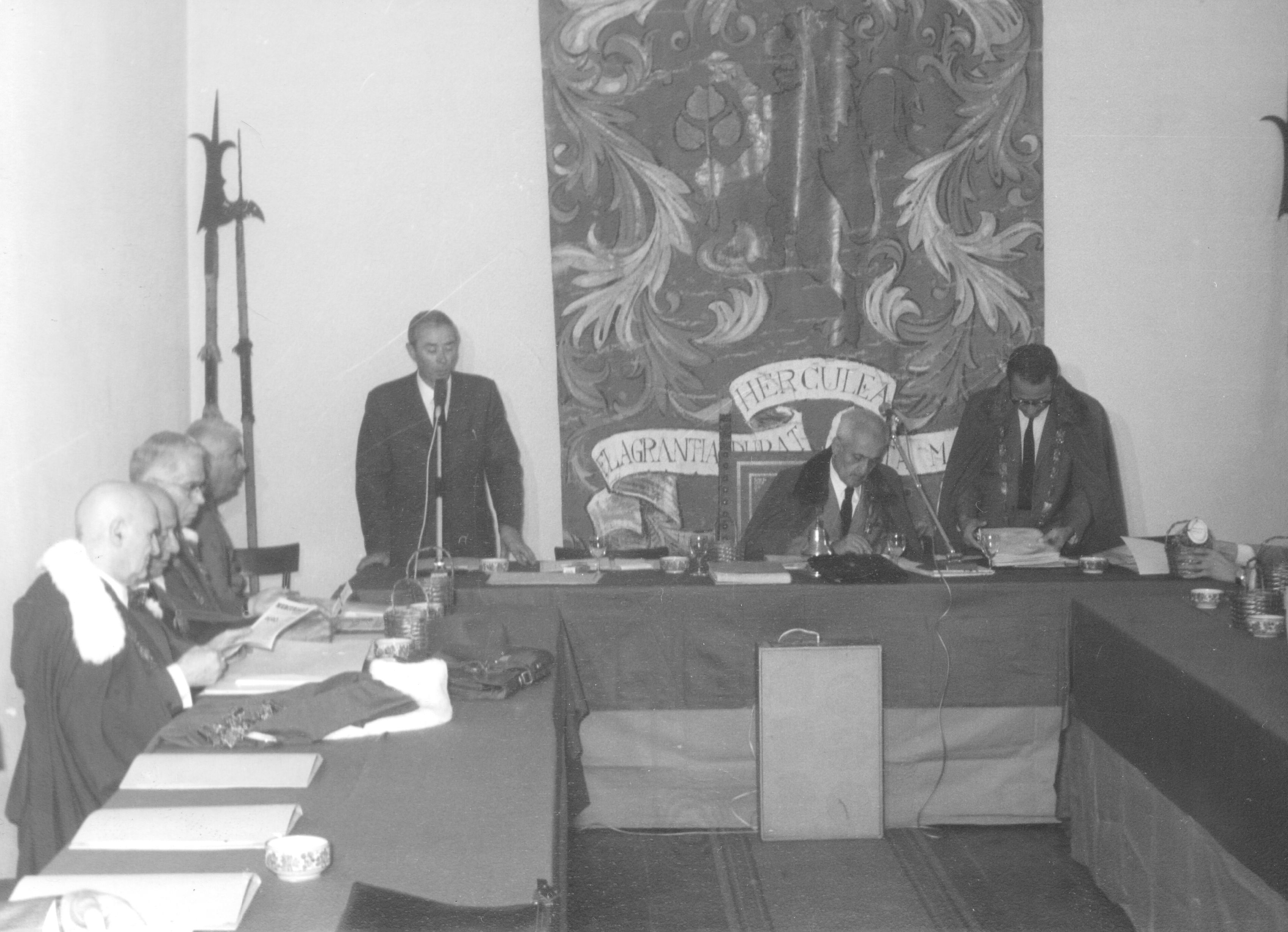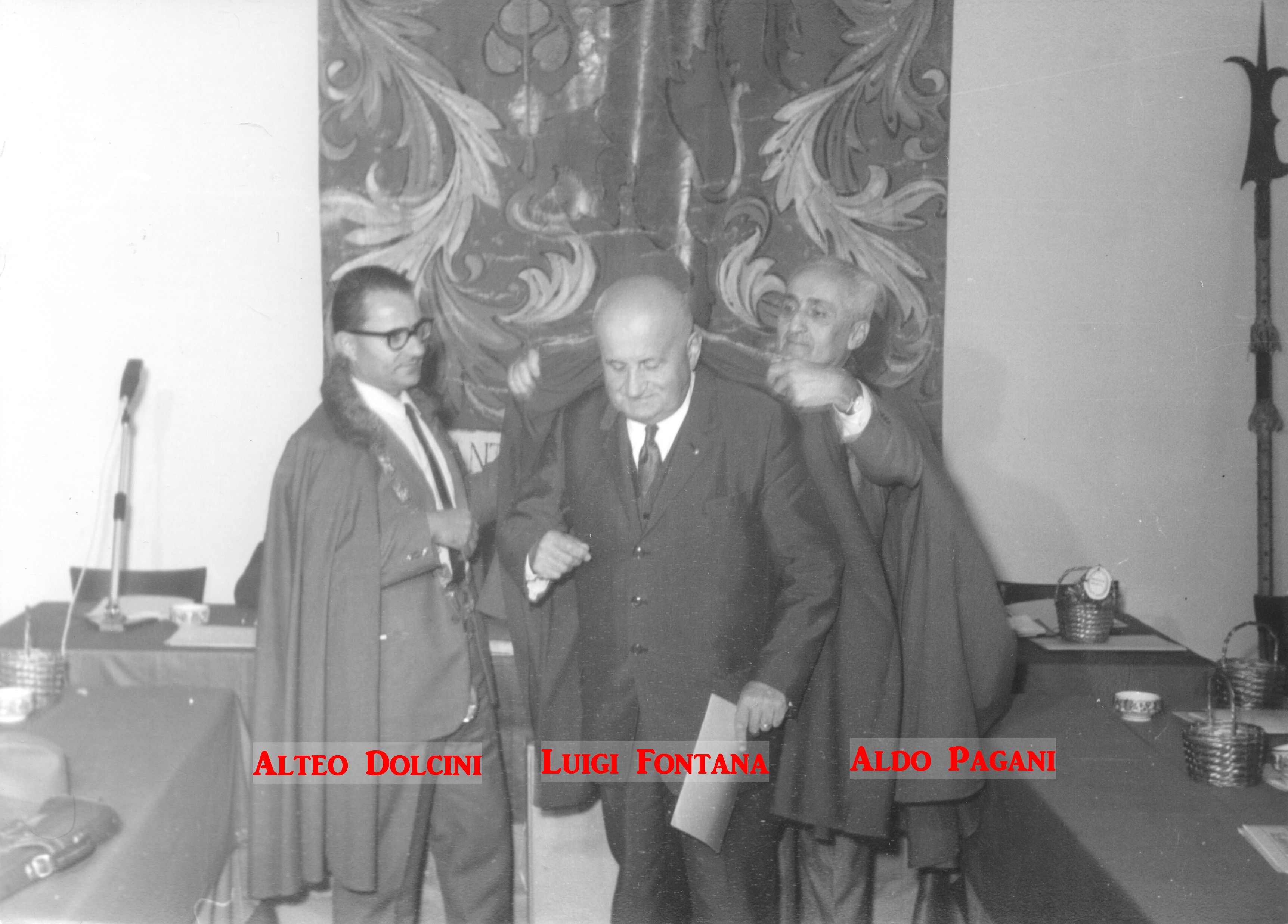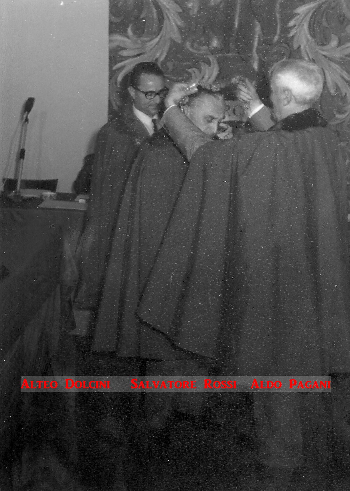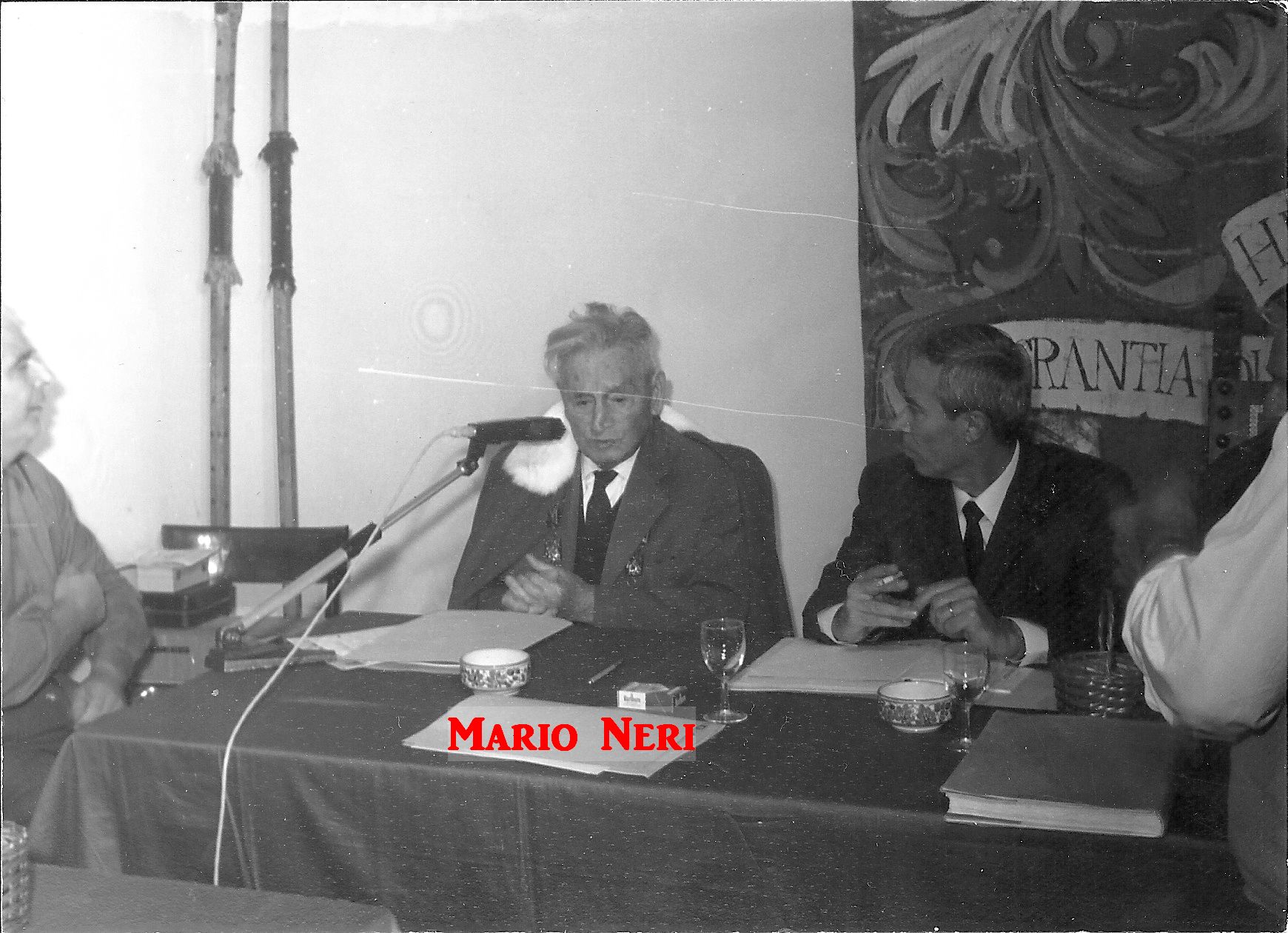 Queste immagini inedite attestano gli avvenimenti e i protagonisti dell’undicesima Tornata del Tribunato di Romagnola, svoltasi il 4 ottobre 1969 presso il Palazzo Sforza a Cotignola. Dalle pagine dell’Acta Tribuni si apprende che nell’incontro di Cotignola si affrontò il tema della lotta giuridica per la difesa dei vini Doc romagnoli (all’epoca Albana, Sangiovese e Trebbiano) e in particolare per vietare “la produzione di qualsiasi sangiovese che non sia di Romagna”. Alteo Dolcini relazionò poi sulla salvezza dei vitigni minori e fu approvato uno specifico documento per salvaguardare cagnina, canena, pagadebit, uvadora e vin di bosco. Tre le incapparellature per i nuovi tribuni Luigi Fontana, Anacleto Margotti, Salvatore Rossi. Nel corso della Tornata intervennero anche i tribuni Mario Neri e Giuseppe Ambrosini rispettivamente sui temi della riscoperta del vitigno della canena e del vino nello sport. Le foto sono state fornite da Emanuele Tonini per l’Associazione Pro Loco di Cotignola.