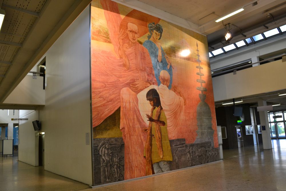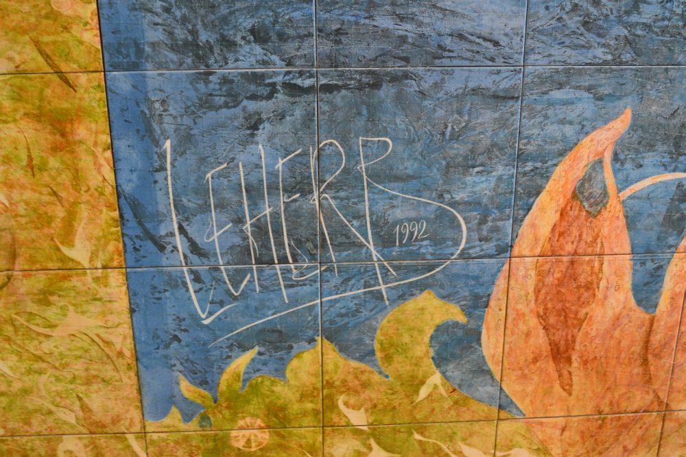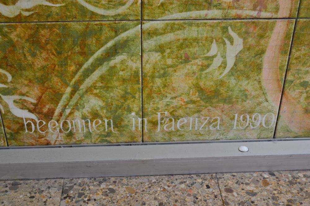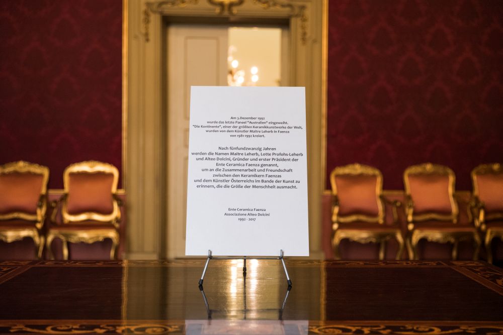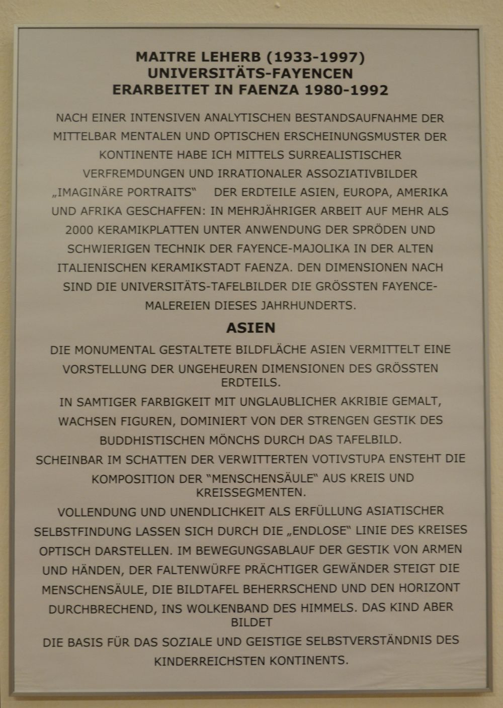 Questo il testo della targa, tradotto in tedesco da Heide Wilm: “Il 3 dicembre 1992 veniva qui inaugurato “Australien”, ultimo pannello della grande opera “Die Kontinente”, una delle più grandi opere ceramiche al mondo, che l’artista Maitre Leherb eseguì a Faenza dal 1981 al 1992.
