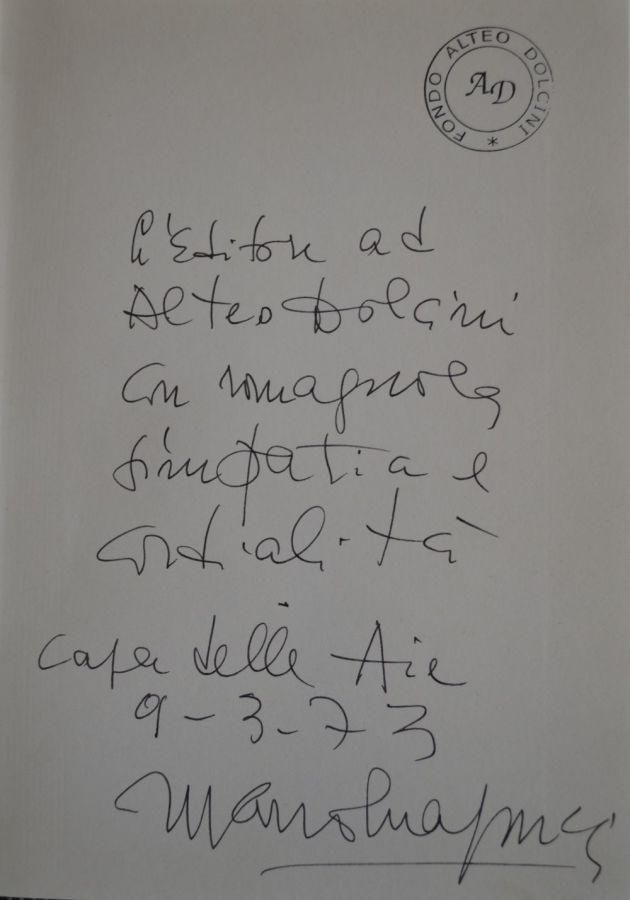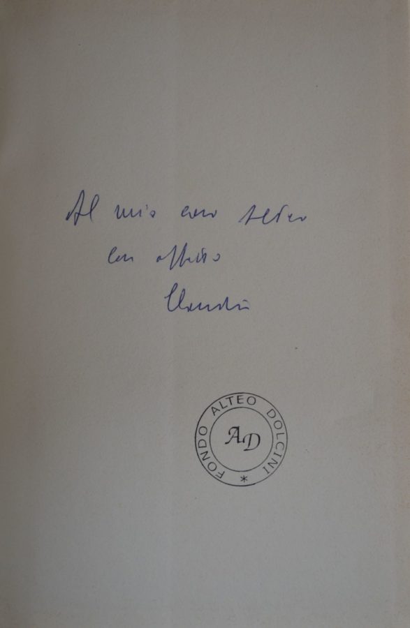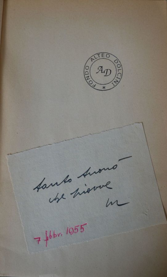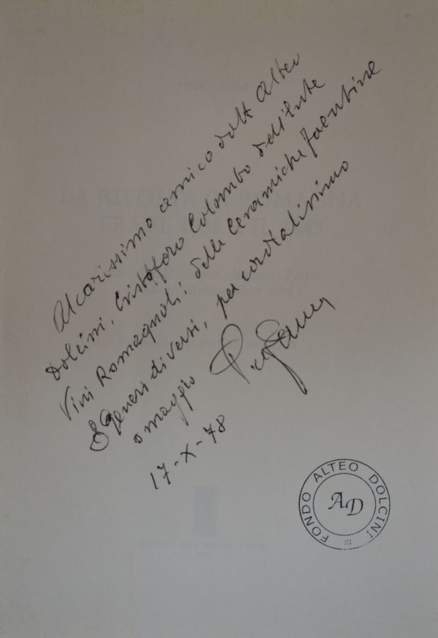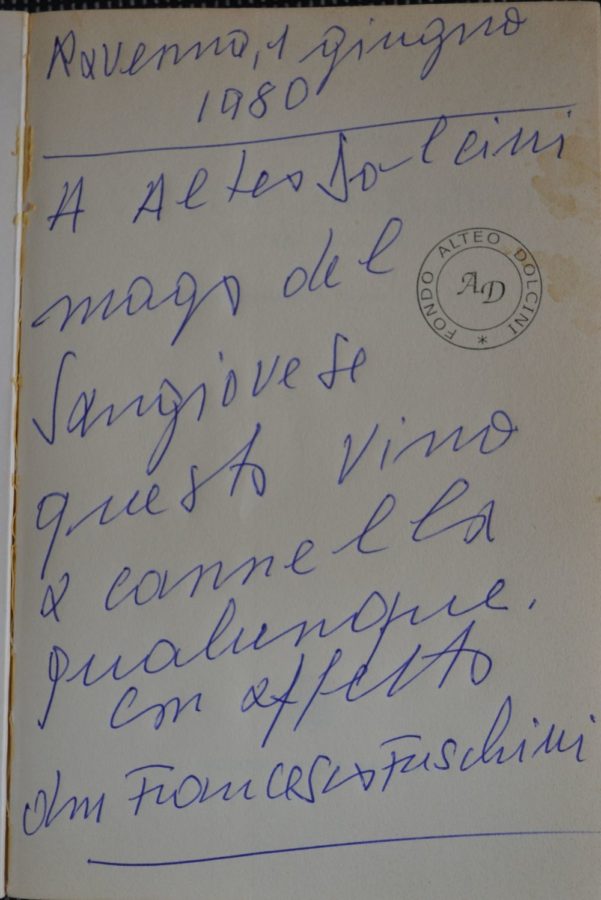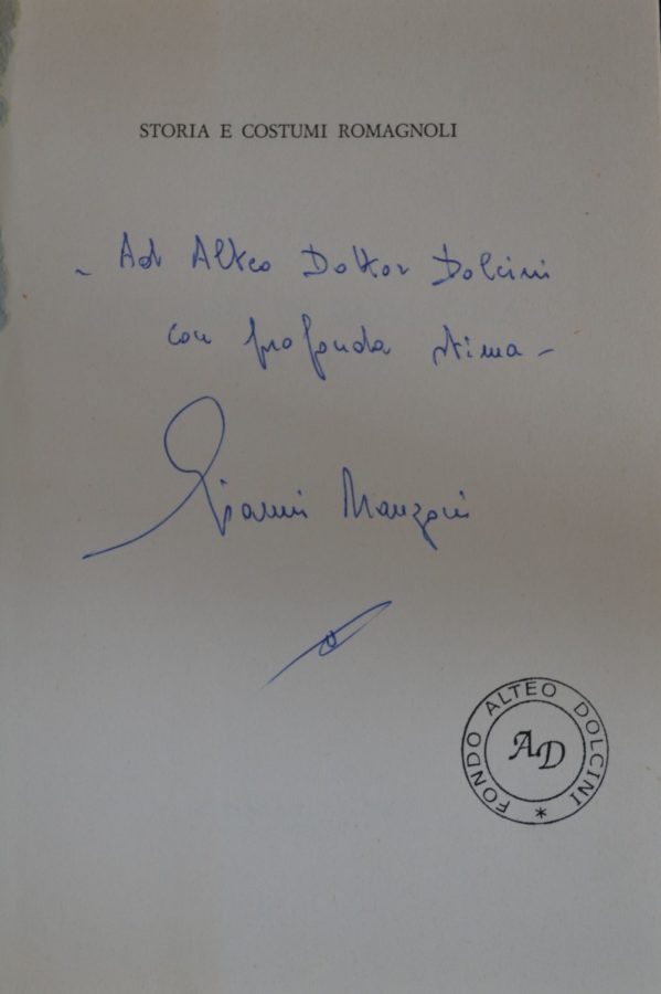 La Biblioteca Alteo Dolcini conserva oltre mille volumi i cui autori o gli argomenti trattati sono tutti attinenti alla Romagna nelle sue declinazioni storiche, artistiche, economiche e politiche. Numerosi volumi recano dediche degli autori ad Alteo Dolcini. La selezione qui proposta presenta autografi di Max David, Don Francesco Fuschini, Giovanni Manzoni, Claudio Marabini, Nevio Matteini, Corrado Matteucci, Mario Lapucci, Stefano Servadei, Piero Zama.