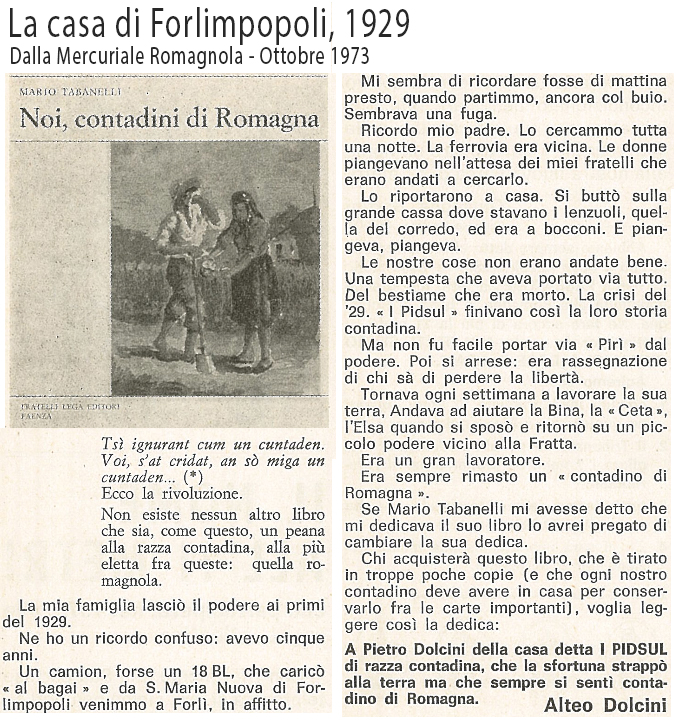 La targa ceramica posta il 12 settembre 2010 sulla casa natale di Alteo Dolcini, in via Prati a Forlimpopoli, offre una valida chiave di lettura per comprendere il suo affetto profondo per la Romagna. Una modesta casa di contadini; i Dolcini, famiglia di braccianti agricoli di umili condizioni, erano costretti a continui pellegrinaggi alla ricerca di condizioni propizie per la loro sopravvivenza. Da Meldola a Fratta Terme, da Forlimpopoli (qui nacque Alteo Dolcini il 12 settembre 1923) fino a Forlì, nel 1929. L’appellativo di “Pidsull” (o Pidsul) identificò la famiglia già nella seconda metà dell’ottocento e AD non lo ha mai disconosciuto. Anzi, è stato per lui un blasone che nobilitava le sue origini, dalle quali seppe riscattarsi socialmente e culturalmente. Non limitandosi ad un percorso individuale ed egoistico ma allargando i suoi sforzi all’intera comunità nella quale riconosceva le proprie radici. La storia dei Pidsull (qui disponibile in formato pdf) è un’epopea contadina che attraversa due secoli di storia italiana. Un diario di famiglia che vede avvicendarsi, di generazione in generazione, un componente dei Pidsull in sette eventi storici dal 1812 al 1974. Narrata da AD nel libro “Il Principe di Romagna”, unisce il ricordo dei racconti degli avi ad esperienze personali, mescolando verità e, talvolta, finzione.