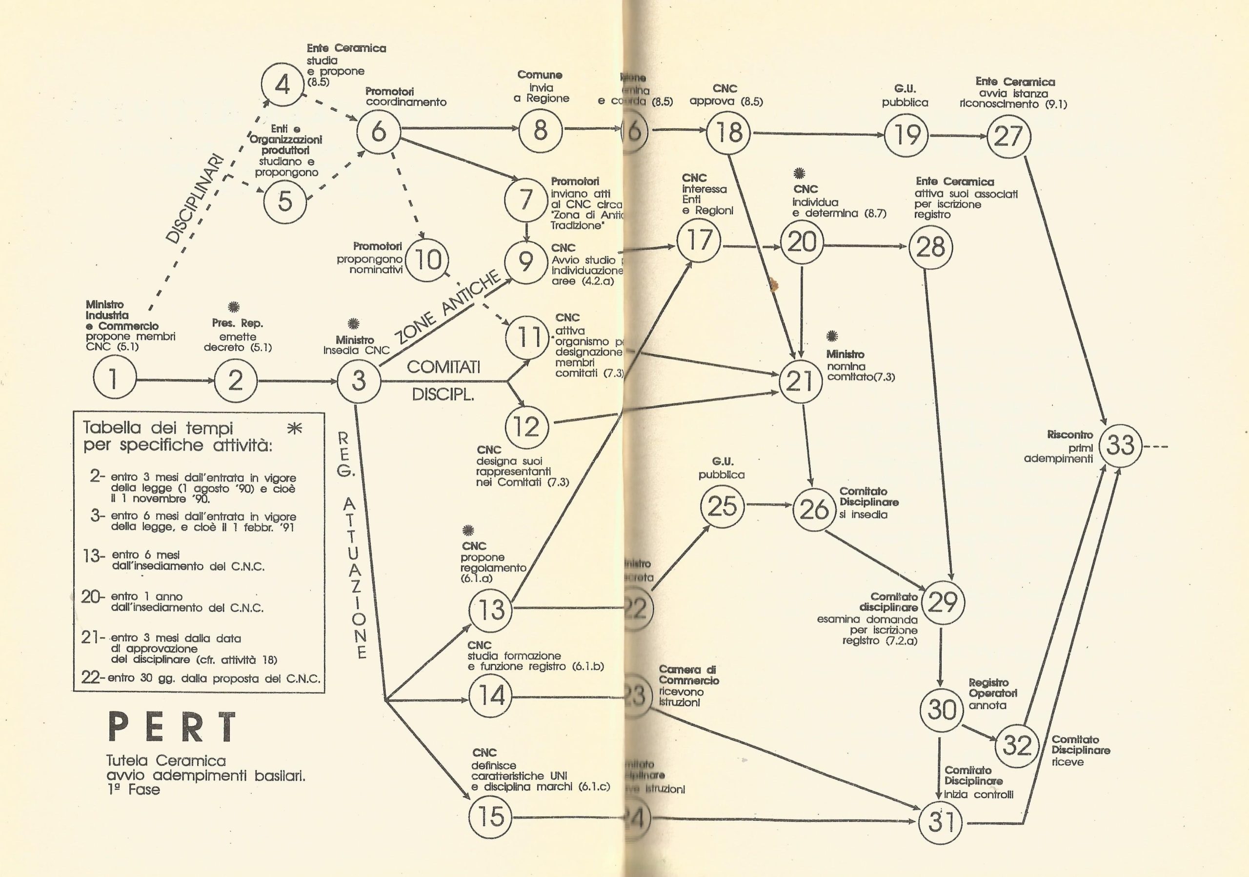Viene presentata anche una scansione dello schema Pert (metodo statistico per la determinazione delle attività e dei tempi di attuazione di un progetto) elaborato da Alteo Dolcini per la Legge 188. L’immagine è tratta dal libro “La D.O.C. alla Ceramica italiana” scritto da Dolcini nel 1991. Lo schema dimostra come ogni aspetto relativo alla predisposizione e all’attuazione della legge fu preso in considerazione da Dolcini per dare concretezza all’originaria idea del 1974. Nel libro Dolcini scrive che: “dobbiamo a Leonardo Melandri la più grande riconoscenza perché mai rappresentante del popolo (dei ceramisti, in questo specifico evento…!) fu più pronto, disponibile, incessantemente attivo nel reperire, prima di tutto, altri colleghi firmatari della proposta di legge, specie di quelli delle zone di antica tradizione ceramica, e far mettere la proposta di legge nel canale delle commissioni per un primo esame”.