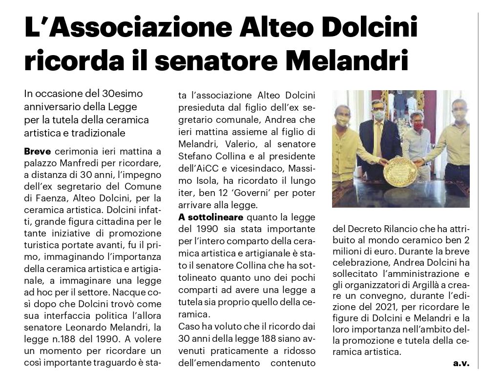 Nella mattinata del 20 luglio l’Associazione Alteo Dolcini ha promosso un incontro nel Palazzo Municipale di Faenza per ricordare l’impegno di Alteo Dolcini e Leonardo Melandri quali fautori della Legge 188 a tutela della ceramica artistica e tradizionale. L’incontro si è tenuto nella Sala Rossa del municipio, a pochi metri da quello che fu l’ufficio di Alteo Dolcini (allora Segretario Generale del Comune di Faenza) dove si svolse nel 1974 la prima riunione per redigere il testo del disegno di legge.