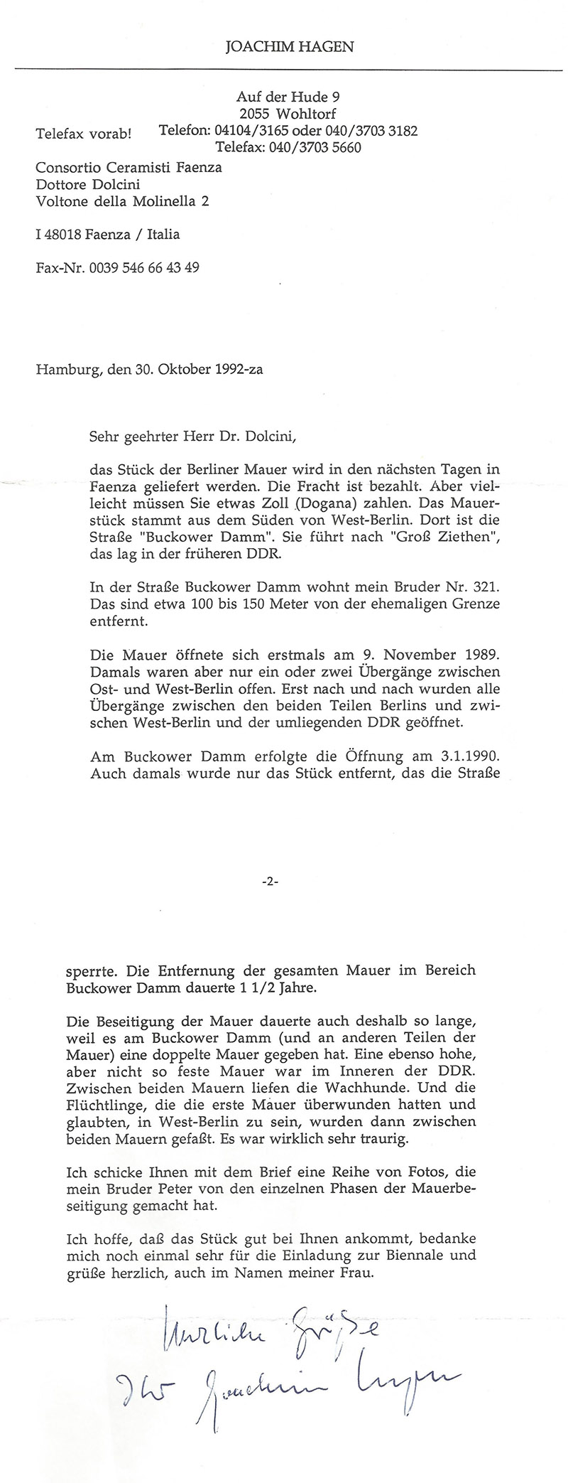Il frammento era stato prelevato nella zona di Buckow Damm a sud di Berlino da Peter Hagen, fratello di Joachim, nel gennaio del 1990 (le foto inedite di quei giorni a Berlino sono presentate nella sezione Immagini). Nella lettera inviata da Hagen, qui riprodotta in fondo alla pagina, è allegata la mappa con indicata la zona in cui è stato prelevato il frammento e sono inoltre citati i documenti doganali per la consegna a Faenza.