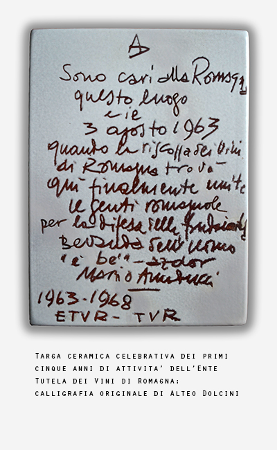 Il Passatore, negli anni sessanta del secolo scorso, diventa il simbolo della rinascita dei vini romagnoli: AD ne è stato la mente, l’anima ed il cuore. E ha sempre ricordato il contributo sia dei maestri a cui si è ispirato sia dei compagni di avventura nel faticoso lavoro di aggregazione delle tante realtà produttive romagnole (così vicine e cosi distanti) necessario per la riscossa dei Vini di Romagna. La targa ceramica a fianco riproduce la calligrafia di Alteo Dolcini e contiene il logotipo riportato nell’home page del sito. Testimonianza dell’impegno di una persona che ha esercitato solo il potere delle proprie idee. Senza disgiungerle dagli ideali. Non è poco. Oggi, in un epoca caratterizzata da sempre più sofisticate tecniche di comunicazione, la memoria storica è spesso relegata a giornate celebrative e a sterili proclami. Ci si dimentica, troppo spesso, chi quando e perché ha reso possibile il raggiungimento di grandi risultati. Oppure lo si fa in maniera parziale o erronea.